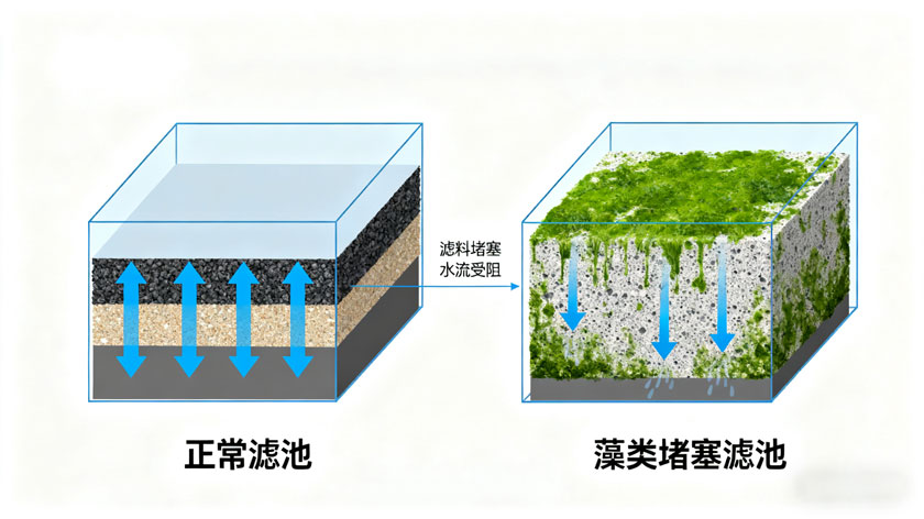 滤池是自来水处理的“把关人”,通过砂、活性炭等滤料过滤水中的杂质。但藻类大量繁殖时,其细胞会附着在滤料表面,形成致密的生物膜,堵塞滤池孔隙,导致水流通量下降,过滤效率大幅降低。